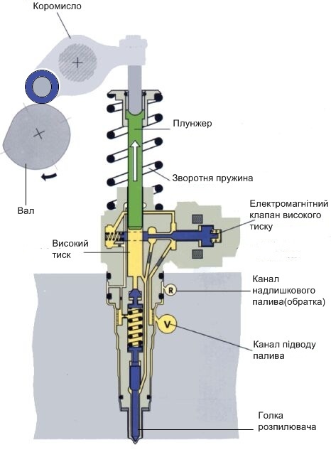 Плунжер слугує для створення високого тиску палива. Поступальний рух плунжера здійснюється за рахунок обертання кулачків розподільчого валу , зворотній – за рахунок пружини. Електромагнітний клапан високого тиску призначений для управління вприском палива (може бути п'єзоелектричний). П'єзоелектричний клапан має більшу швидкодію. Основним конструктивним елементом клапана є голка клапана.